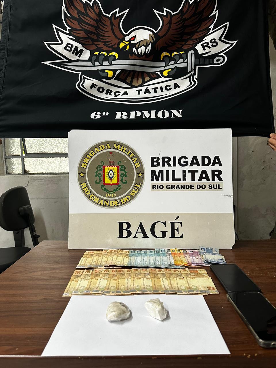 Na tarde desta segunda-feira(6) em Bagé, durante patrulhamento tático motorizado, a equipe da Força Tática diante de informações que um casal em um vectra azul estaria distribuíndo entorpecentes na região dos bairros Castro Alves e Passo das Pedras, logo foi visualizado na Rua Astrogildo Amaral no contra fluxo o veículo Chevrolet Vectra de cor azul, onde a equipe retornou e realizou a abordagem do veículo. E em revista pessoal foi localizado com o condutor, duas porções de cocaína e o dinheiro com a mulher. O motorista do veiculo confirmou que o dinheiro seria oriundo das entregas de drogas que já teria realizado.