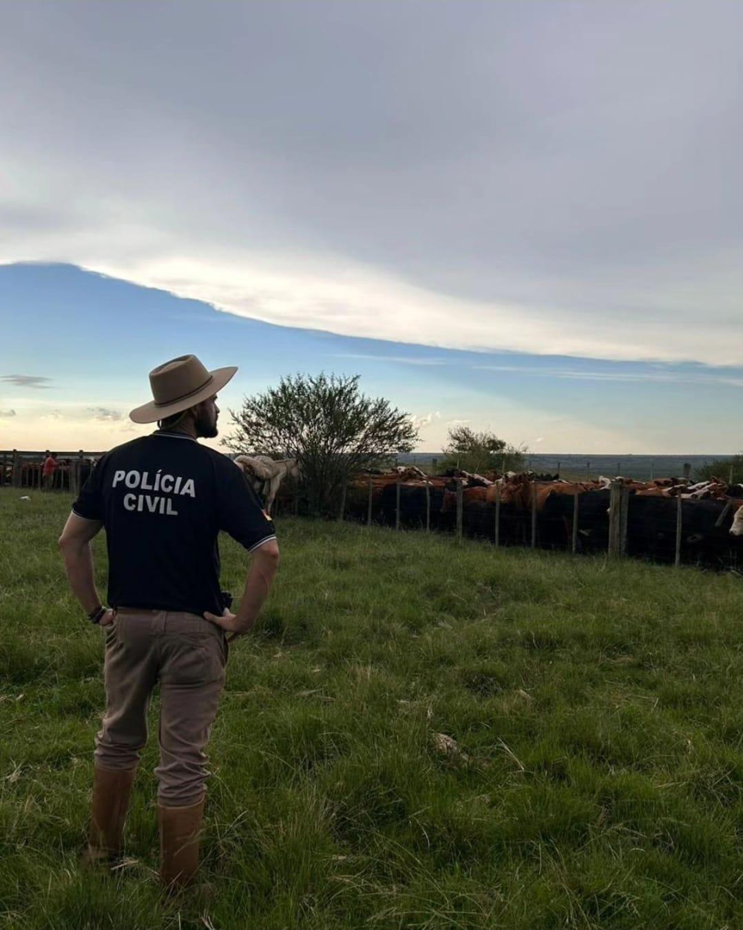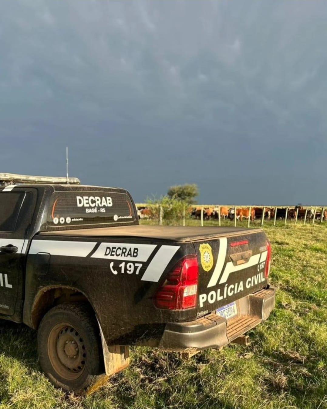 A Polícia Civil, através da DECRAB e DRACO/ Bagé com apoio de policiais da equipe da Operação Protetor de Fronteiras e Divisas base Pedras Altas e fiscais da Secretaria de Agricultura, Pecuária Produção Sustentável e Irrigação, aprendeu 531 animais bovinos sem procedência em área pública irregular para criação de animais bovinos. Os policiais também encontraram no campo um tijolo de maconha pesando 600 gramas.